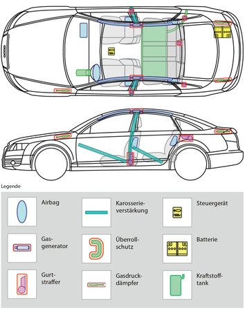 Wenn Sie eine Rettungskarte besitzen, prüfen Sie ob diese zu ihrem Fahrzeug passt, wenn dies der Fall ist befestigen Sie diese hinter der Sonnenblende und kleben Sie den "Rettungskarte im Fahrzeug“ am linken oberen oder unteren Rand der Windschutzscheibe an (Den Aufkleber gibt es in jeder ADAC-Geschäftsstelle).